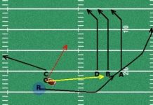 Similar to the hand-off flag football drill, but emphasis on the quarterback pulling the ball back out of the running back’s arms. This drill should be practiced in the early season for 3-5 minutes every practice until it becomes perfected by the players. It can be worked in with the hand-off drill by alternating, and can be also used as part of advanced combo drills.